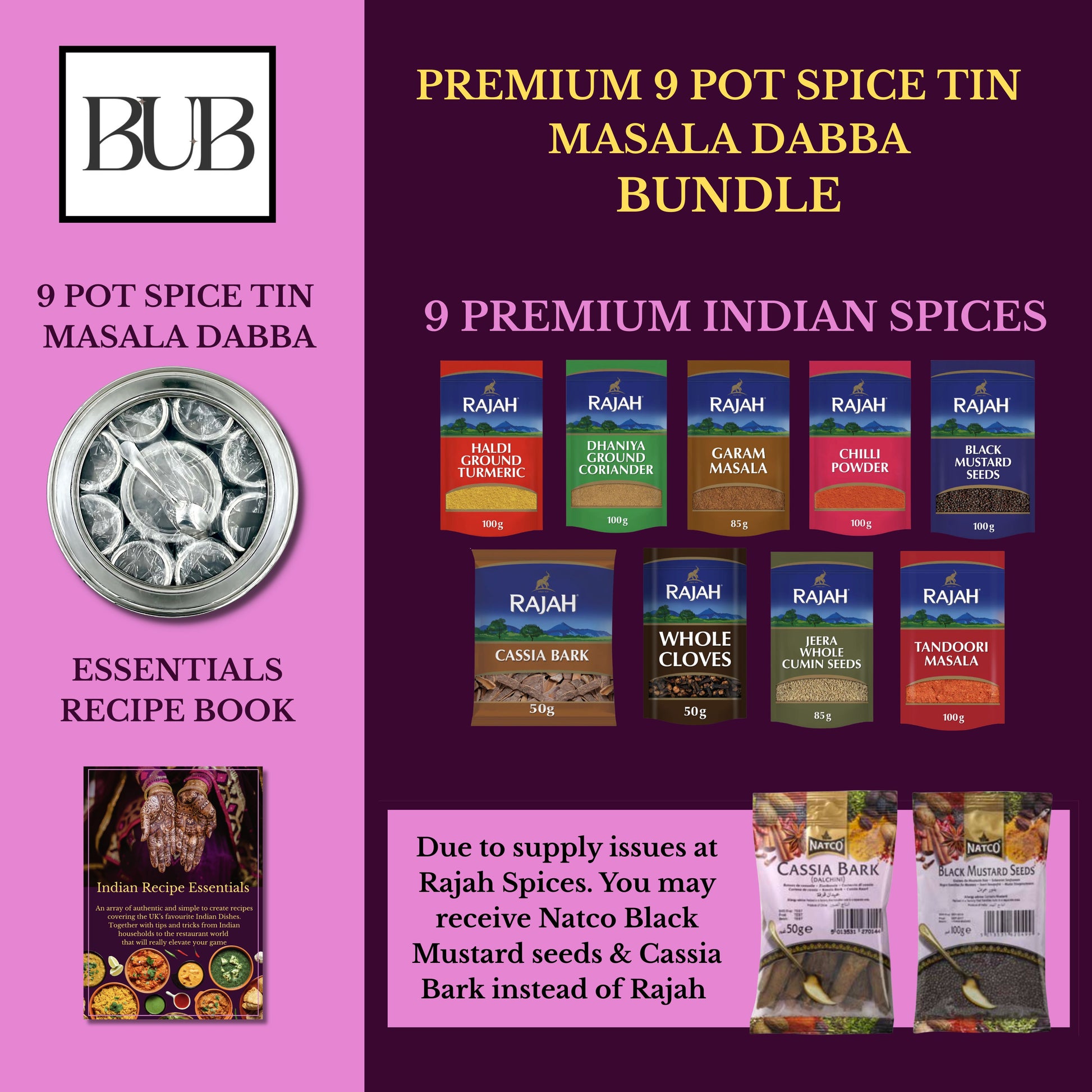 BUB Large 22cm Premium Stainless Steel Masala Dabba — Complete Indian Spice Box with Rajah Spices & Recipe Book