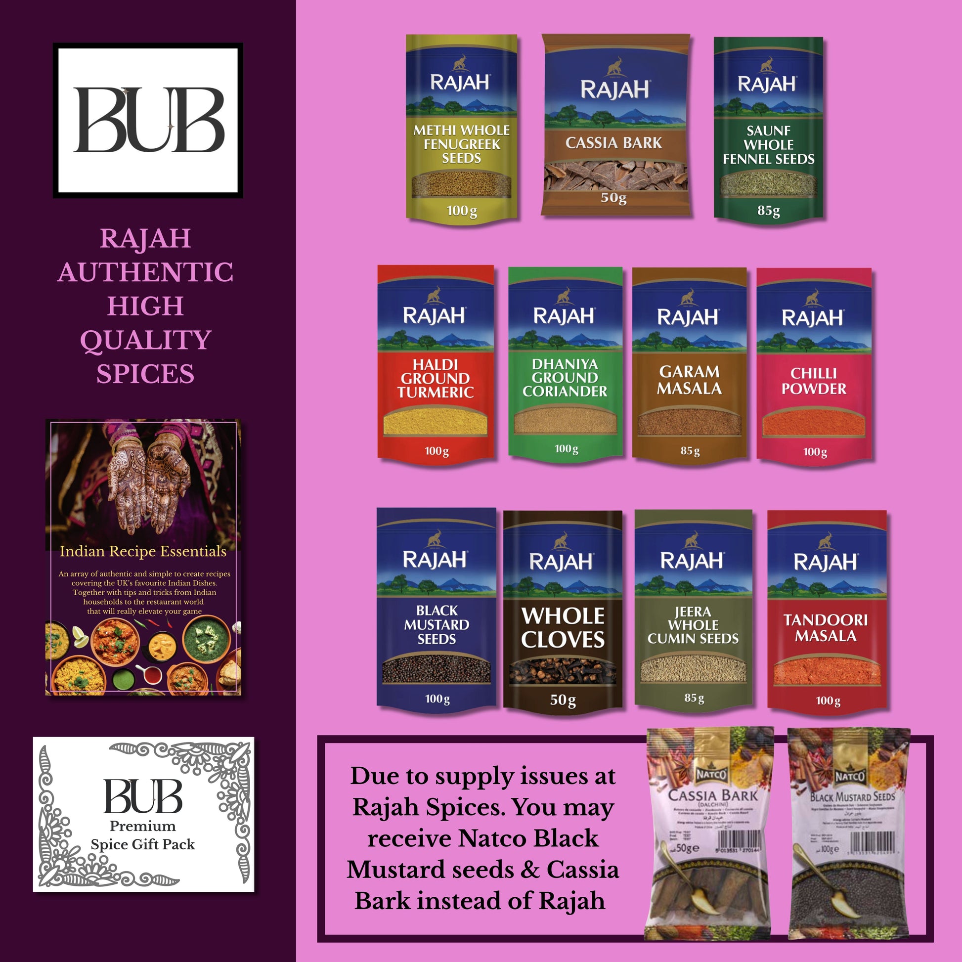 - Premium Spice Box contains Rajah Spices: Garam Masala, Cumin Seeds, Ground Coriander, Turmeric, Chilli Powder, Black Mustard Seeds, Tandoori Masala, Cassia Bark (Cinnamon), Cloves, Bay Leaves, Fennel Seeds & Fenegreek Seeds - 11 Items